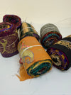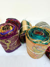 Border Sari Silk Ribbon Rolls are crafted from the remnant borders and hems of sari manufacturing in India, giving new life to these beautiful textile leftovers. Each roll is unique, showcasing intricate designs and traditional craftsmanship.