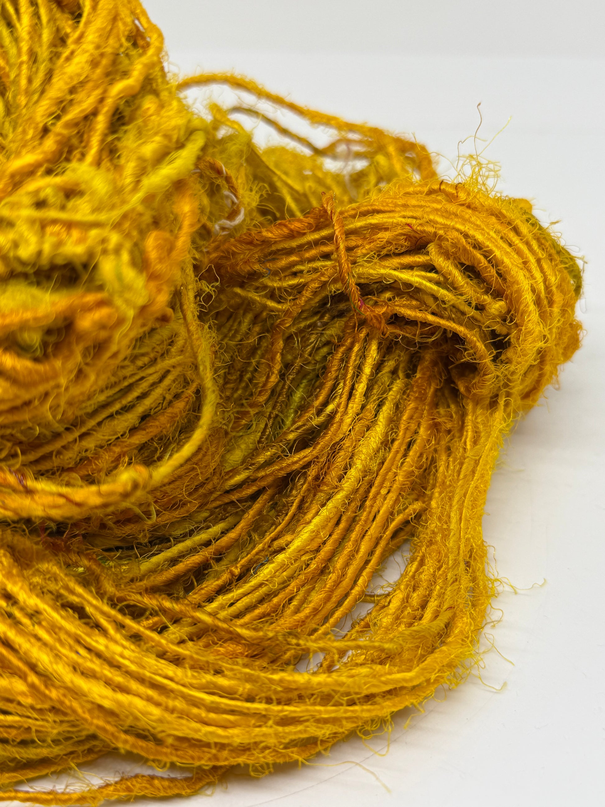 Beautiful textures waste silk yarn handspun in backyards in rural India in mixed golden yellow shades.